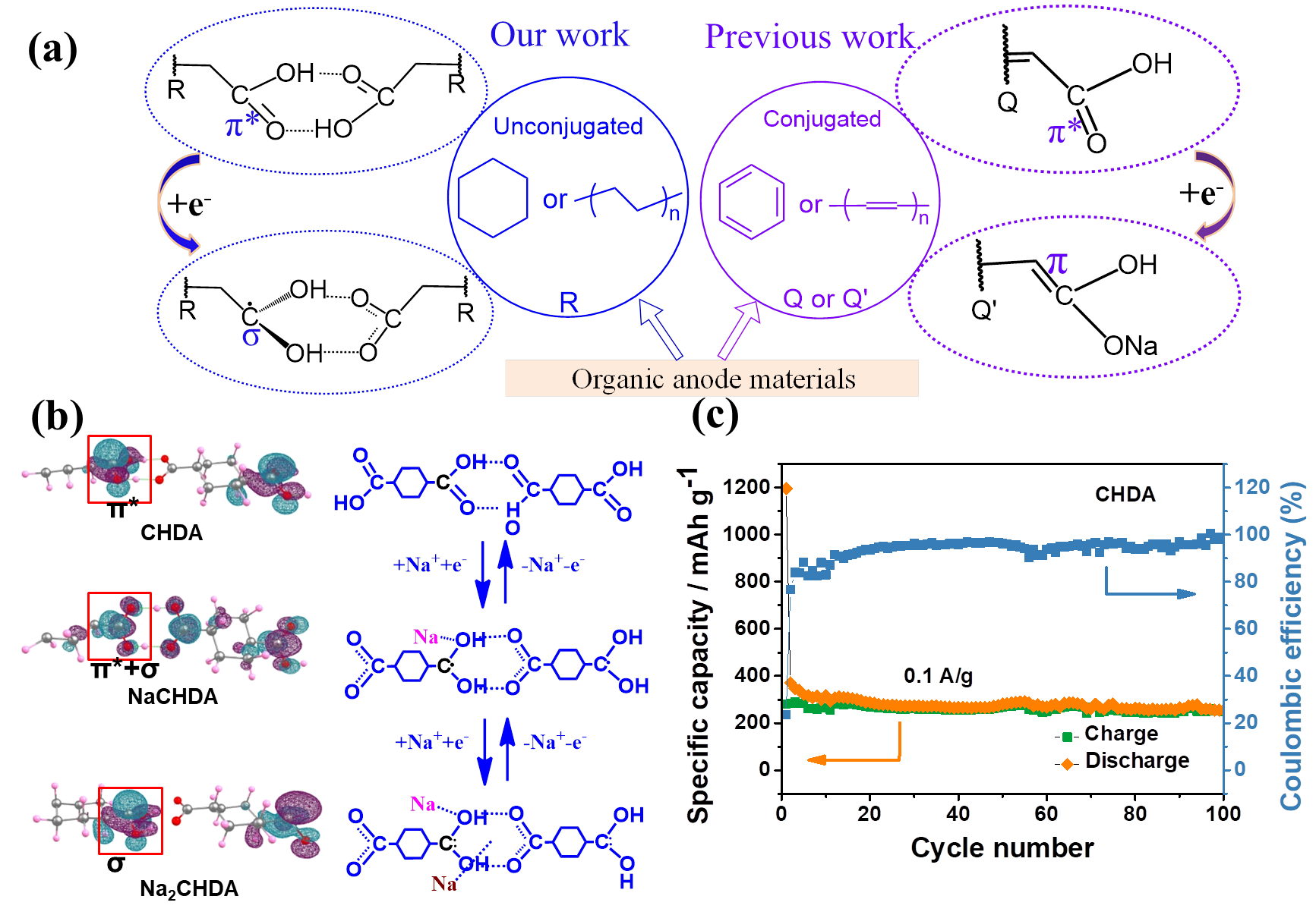 陈接胜教授、王开学研究员团队与中科院上海硅酸盐研究所刘建军研究员团队合作,在以非共轭体系羧酸类化合物作为钠离子电池负极电极材料方面的研究取得了重要进展。以1,4-环己二羧酸(CHDA)为例,结合实验与理论计算结果,首次提出了非共轭体系羧酸类化合物作为负极电极材料的氢转移储钠机制,即在电化学反应中,两个相邻羧基之间的氢转移会激活羧酸盐官能团的电化学活性,间接促使π*反键轨道向σ成键轨道转变以稳定电子。CHDA负极电极材料具有良好的可逆性和相对恒定的电压。基于以上结果,该工作还对大量非共轭有机化合物进行了预测,为电极材料的选择做出了重要的补充。这项工作将有机电极材料从共轭体系扩展到了非共轭体系,并确定了储钠过程中的氧化还原活性中心,为新型高容量、高可逆性钠离子电池负极材料的开发提供了新思路,为有机电极材料氧化还原反应活性中心的确定提供了新策略。