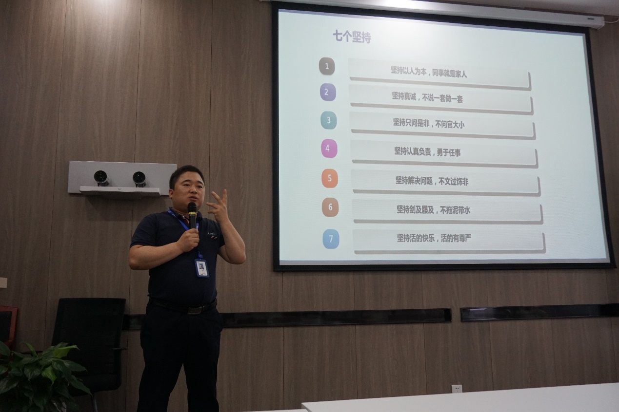经过简短的开营仪式,文化建设部的鲁喜庆经理为实践团成员做了题为《与奋斗者同行》的报告,报告主要向同学们介绍了CATL的工口实验室。报告伊始,鲁经理以“文化”的定义来引出工口实验室的概念:“各位同仁共同的行为准则和价值判断”。而宁德时代的行为准则与价值判断的核心便是奋斗文化,CATL的愿景是“在中华文化下做世界一流的创新科技公司,为人类新能源事业作出卓越贡献的同时,为全体员工的精神和物质的福祉而努力奋斗。”随后鲁经理从历史、道路、抱负以及环境四个方面向同学们解读了宁德时代工口实验室的内涵。他坦言,尽管公司发展很快,体量也在不断壮大,近年更是被外界直呼“独角兽”。但这还不够,要想持续稳定地进步,需要建设出优秀的工口实验室。