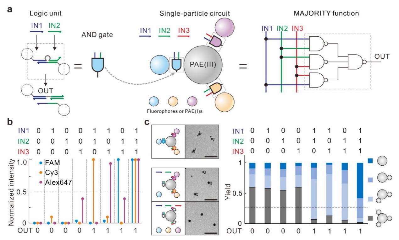 对微观尺度的分子或材料进行精确的动态调控,体现了人类对微观世界的认知与操控能力。然而,对纳米粒子的精确动态调控仍然充满挑战。在生物体中,生物分子机器具有极为精巧的结构并受到严密的时空调控,而这些复杂结构的时空排布信息是由一维的DNA分子序列所编码而成的。受此启发,该团队提出利用多嵌段的单链DNA序列来编码金纳米粒子表面的价键信息,进而构建具有离散价态与正交价键的“纳米”原子。以这些“纳米”原子为基元,可以通过正交的DNA配对自组装形成具有精确颗粒数和各向异性的“纳米”分子。而这些“纳米”分子在合成后仍然具备可重排的能力。因而,利用DNA链取代反应,可以引发动态的“成键”与“断键”,模拟加成、分解、置换和复分解等多种基本化学反应。他们还基于这一体系设计了 单颗粒逻辑门,并集成为投票机”逻辑电路。当多数输入信号为正(“赞成票过半”)时,“纳米”分子解离;当只有少数信号为正时,“纳米”分子不发生解离反应。这些精确组装而具有动态响应能力的纳米“原子”和“分子”有望应用于生物智能诊断与治疗等领域。 撰稿:樊春海团队