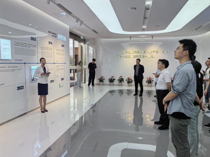 首先,实践团成员共同参观了“大零号湾”科技创新策源功能区展示馆,近距离了解了“大零号湾”的发展历程、科创资源、创新成果以及产业布局。“大零号湾”科技创新策源功能区是江川路街道打造现代化滨江新城区的主要阵地,展馆中陈列着各类科技创新成果及科技发展成效,其中丁文江院士团队的镁合金研究成果展示了其在轻质高强材料领域的卓越贡献,加深了实践团成员对科研实用性和前瞻性的认识;上海骄成超声股份有限公司的超声波焊接质量检测设备,以其精准的检测技术和在先进电池制造等领域的广泛应用,给党员同志们留下了深刻印象;JIKA机器人公司展示的机器人技术及其在实际应用中的成功案例,也让大家对未来智能化的发展充满了期待。