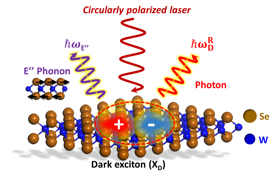 通过低温光致发光光谱 (PL),在高质量的BN/WSe2/BN三明治结构器件中发现,自旋禁闭的暗激子可以通过位于Γ点手性E’’声子的相互作用,从而和自旋允许的亮激子相互耦合,同时释放一个手性声子和一个圆偏光子。因此,我们发现一个全新的合二为一的准粒子(X_D^R),不仅具有暗激子的长寿命,同时还有亮激子的量子性质,为开发下一代量子信息处理和存储器件提供坚实基础。