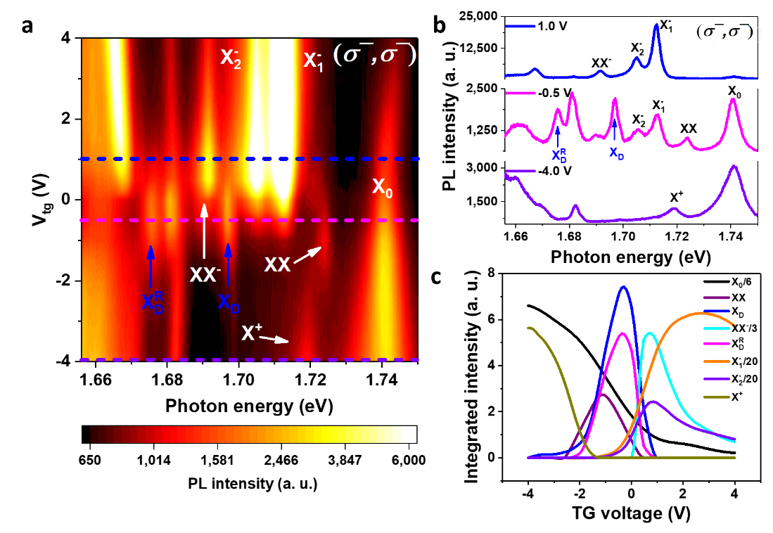 其次,通过改变不同载流子浓度,发现X_D^R和X_D都只出现在接近电中性的区域,排除X_D^R是带电暗激子的可能,并且X_D^R和X_D的在光谱上的能量差为21.6 meV。