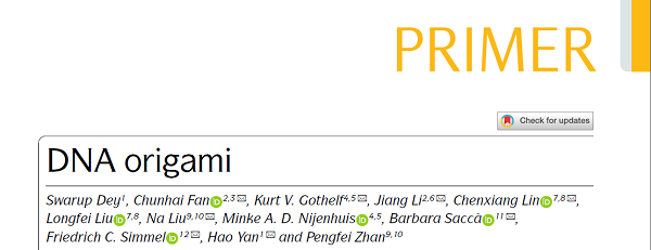 近日,应Nature系列新上线期刊Nature Methods Reviews Primers邀请,工口实验室 樊春海院士领衔组织了DNA纳米技术领域多个国家的知名学者,包括美国亚利桑那州立大学Hao Yan教授、耶鲁大学Chenxiang Lin教授,德国慕尼黑工业大学Friedrich C. Simmel教授、杜伊斯堡-埃森大学Barbara Saccà教授、马普研究所Na Liu教授,丹麦奥胡斯大学Kurt V. Gothelf教授,中国科学院上海高等研究院/张江实验室李江研究员等,共同撰写了题为 “DNA origami” (DNA折纸术)的领域引导性综述,并发表于该刊2021年1月的创刊号上(//doi.org/10.1038/s43586-020-00009-8)。编辑同期配发了PrimeView进行推介。