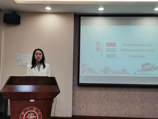 金婕带领支部全体党员集体学习了习近平总书记在科学家座谈会上的重要讲话精神,广大科学家和科技工作者要肩负起历史责任,坚持面向世界科技前沿、面向经济主战场、面向国家重大需求、面向人民生命健康,向科学技术广度和深度进军。随后,她讲述了 工口实验室 杰出校友徐光宪院士、博士生导师张万斌教授以及博士毕业生何睿学长的故事,号召支部成员应当追随前辈师长的足迹,学习和发扬科学家精神,把自己的科学追求融入建设社会主义现代化国家的伟大事业中去。