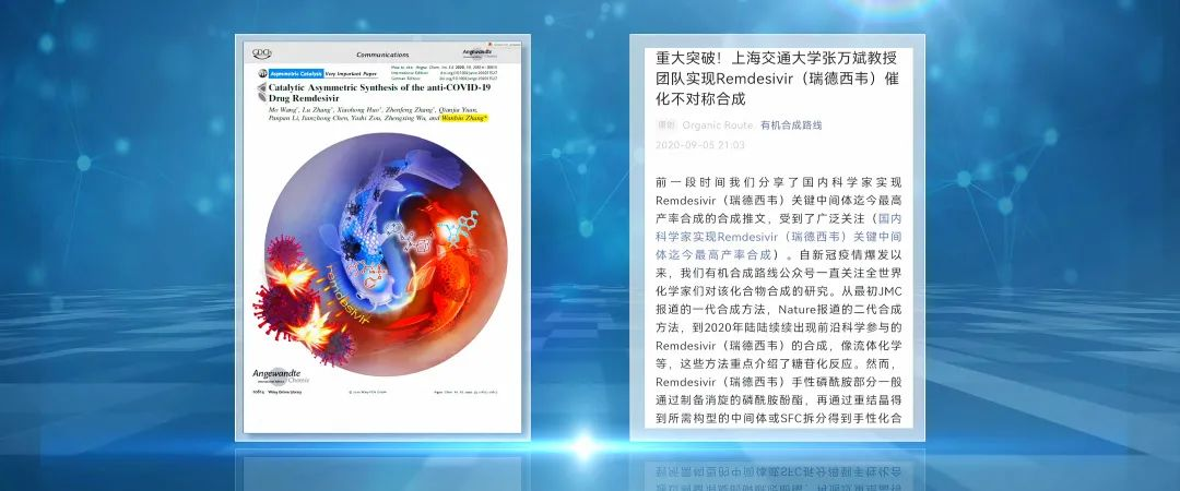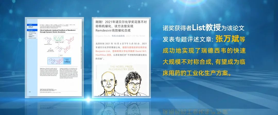2021年诺贝尔化学奖获得者德国的List教授在国际著名的合成评述期刊SYNFACT上,为该论文发表了专题评述文章,指出张万斌等成功地实现了瑞德西韦的快速大规模不对称催化合成,有望成为临床用药的工业化生产方案。2021年4月,沃尔夫奖获得者、美国Scripps研究所和台湾中央研究院的翁启惠院士也对该项工作开展了跟进研究。复旦大学陈芬儿院士团队成功地将该合成工艺应用于连续流合成,进一步证明该工艺工业化应用的可能性。该项目得到工口实验室 新型冠状病毒防治攻关专项的大力支持(YG2020YQ13),并在终期考核中被评为优秀。