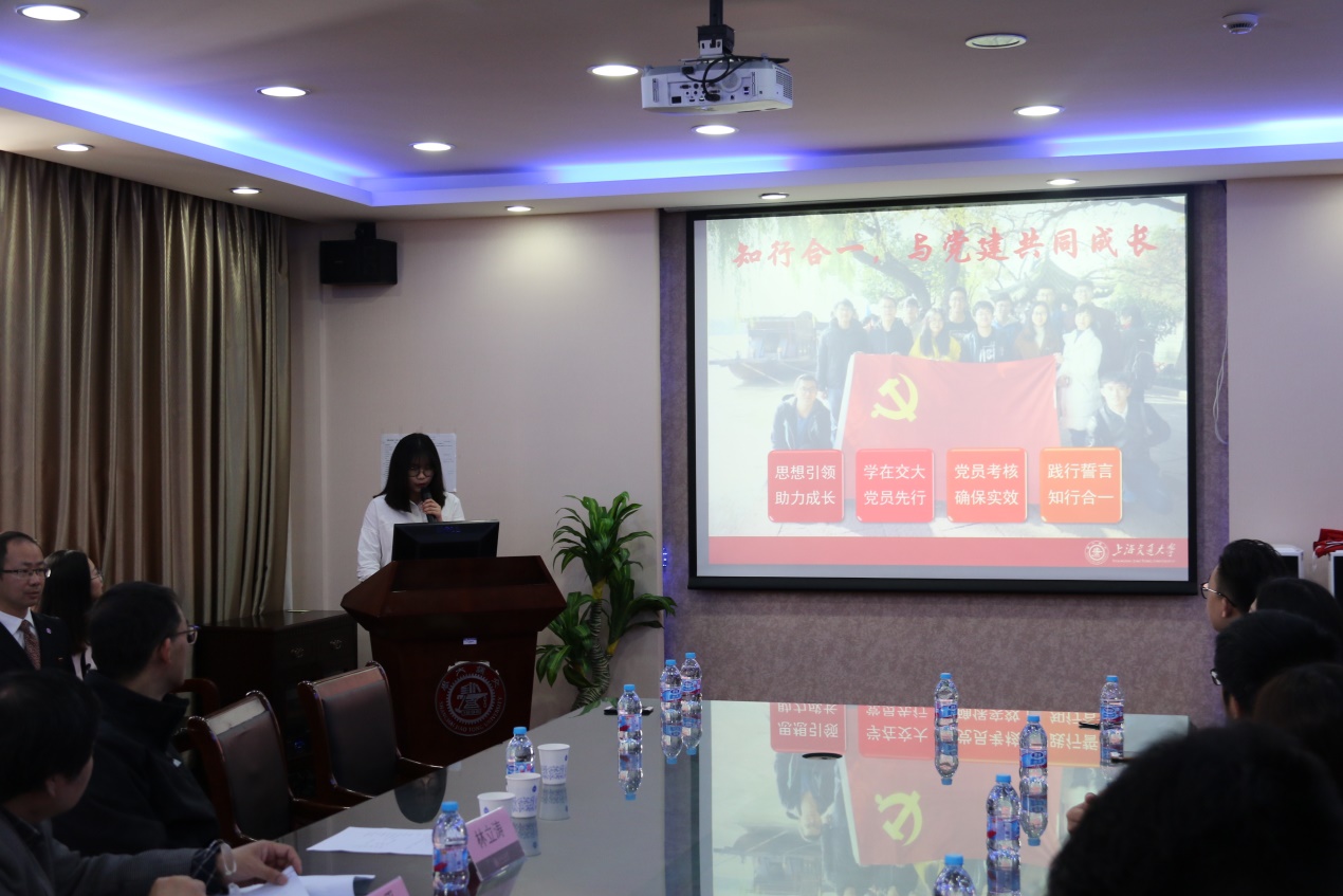 陈洲立代表本科生联合党支部做了“与党建共同成长”工作总结,从“思想引领”、“学在交大”、“党员考核”、“知行合一”四个方面汇报了本科生联合党支部的工作。