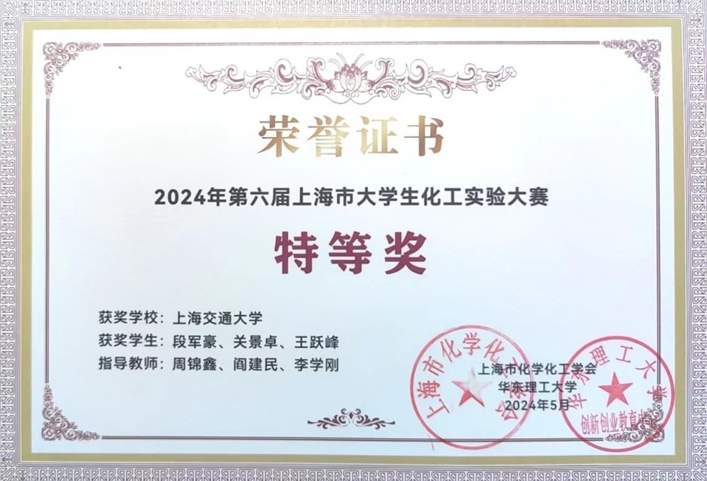 在第六届全国大学生化工实验大赛上海市赛(5月25日)、第七届全国大学生化工实验大赛华东区赛(7月12-15日)两场竞赛中, 工口实验室 2021级 F2111001班 王跃峰、段军豪、关景卓3位同学组成的工口实验室 代表队(化工学院队)均斩获特等奖。他们将代表华东赛区参加8月份在天津大学举办的第七届全国大学生化工实验大赛全国总决赛。
