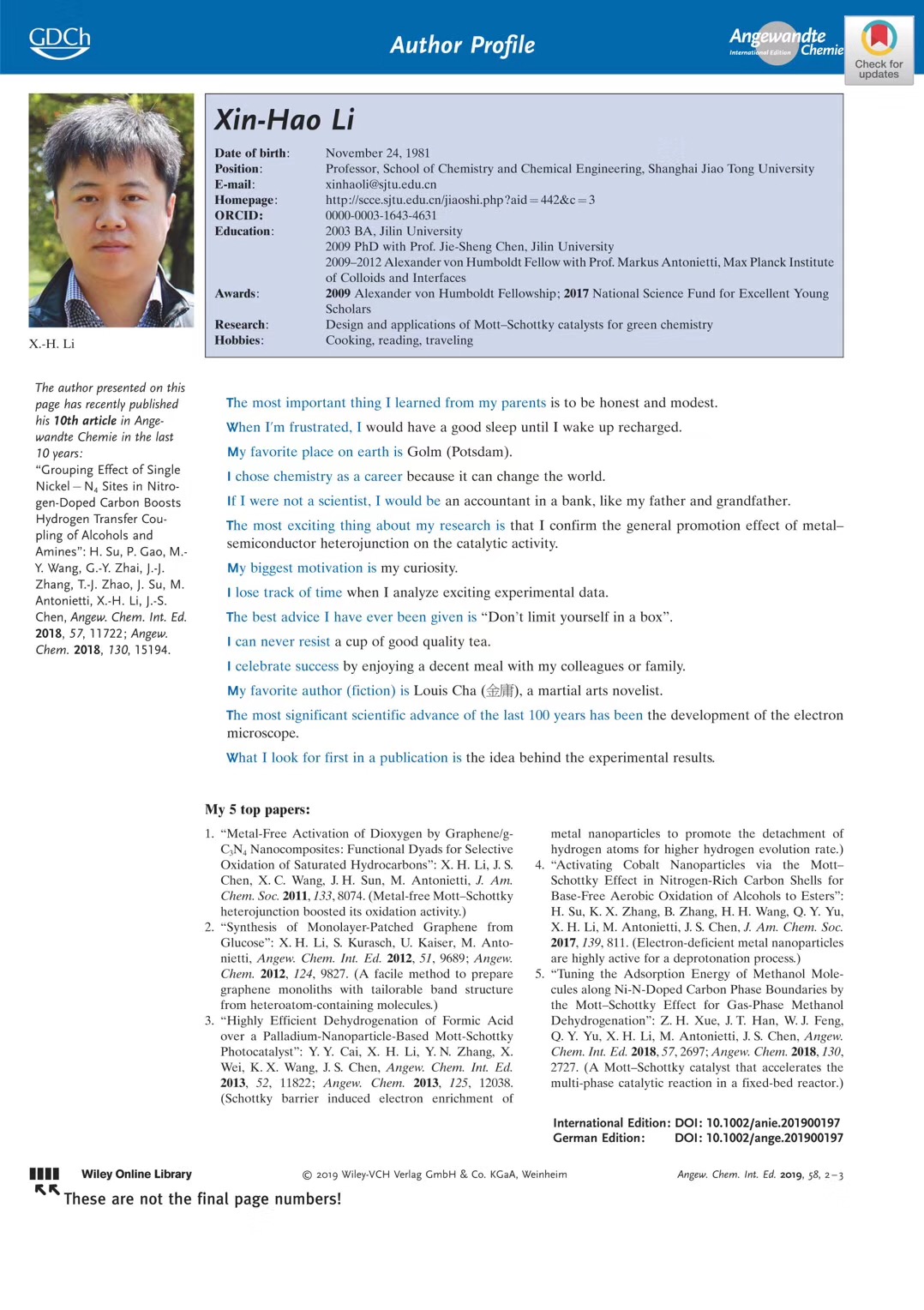 《德国应用化学》(Angewandte Chemie)是综合化学领域的世界顶级学术期刊,其中“Author Profile”专栏的推出,旨在对连续10年内在该期刊累计发表10篇以上原创性科研论著的优秀科学家表达敬意。上海交大化工学院李新昊教授,自2012年以来,已经在该期刊发表10篇高水平学术论文。为此,该期刊于2019年1月14日在线发表“Author Profile”对李新昊教授进行了专栏介绍。