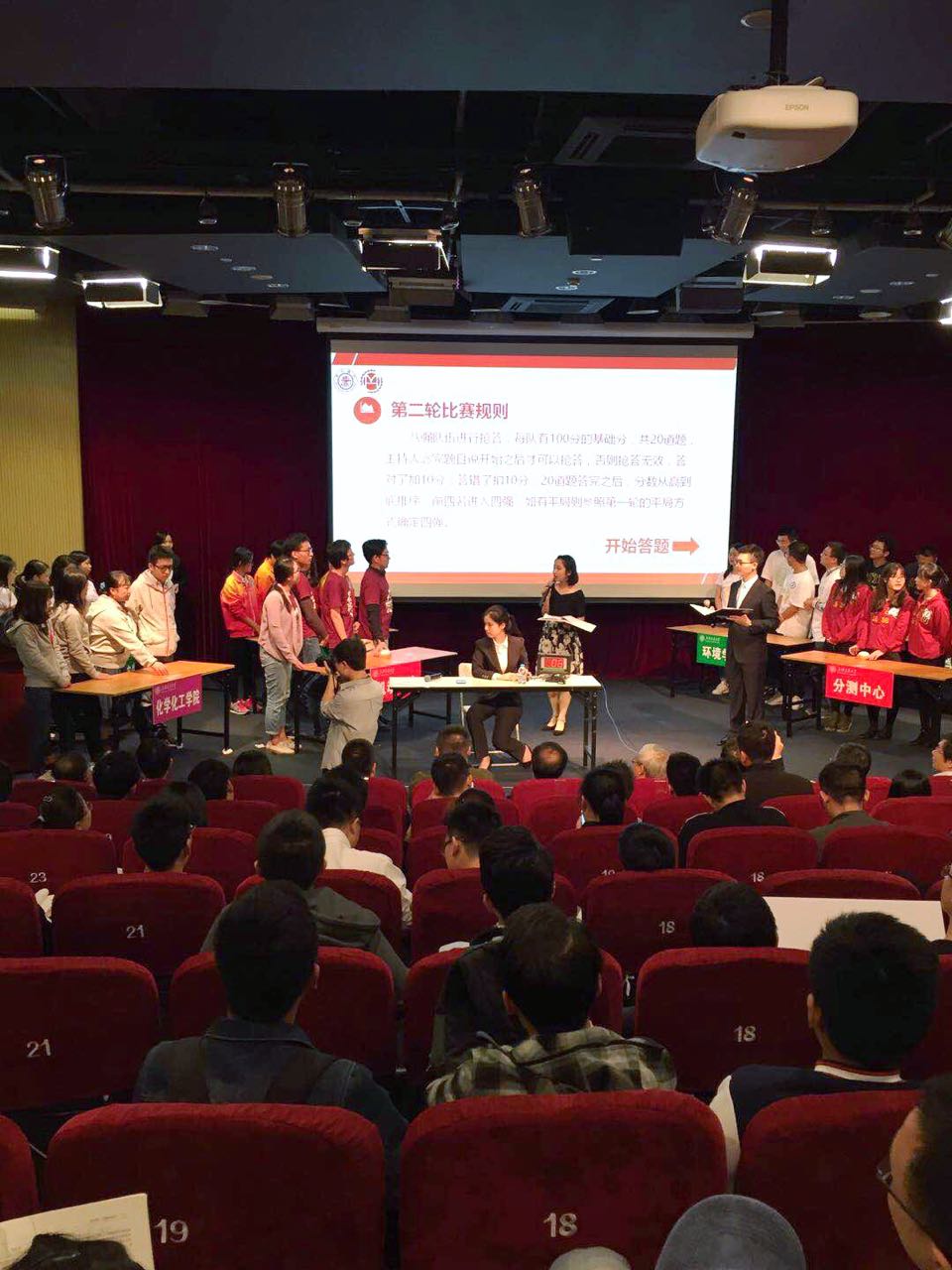 第二轮8进4的比赛采取抢答的比赛形式,答对得10分,答错扣10分,20题目过后得分高的进入下一轮,前几题队员们仿佛对抢答器不太熟悉,没有抢到题目,但是接下来大家渐入佳境,答对几道题。之后几题队员们在计算过场上各队得分后,明智的选择保守策略,稳稳的以分数第三的成绩进入下一轮。