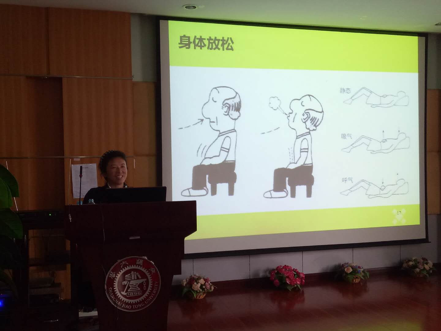 最后,薛老师告诉大家,首先要改变对压力的看法——压力并不完全有害,适当的压力有益提高工作效率。我们要学会把压力视为一种动力,了解它,接受它,享受它所带來的张力。真正解决压力之道是在面对问题时,把问题根本解決,而不是逃避压力。其次,压力过大时,可以通过深呼吸来缓解压力。老师让大家跟着她做放松练习:闭上眼睛,静静聆听,在她的的指导下跟着节奏深呼吸、放松肌肉、放松思维……