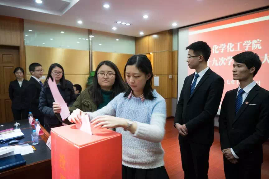 演说结束后,在场的学生代表认真慎重地填写了手中的选票,并依次庄严地将选票投入了票箱。