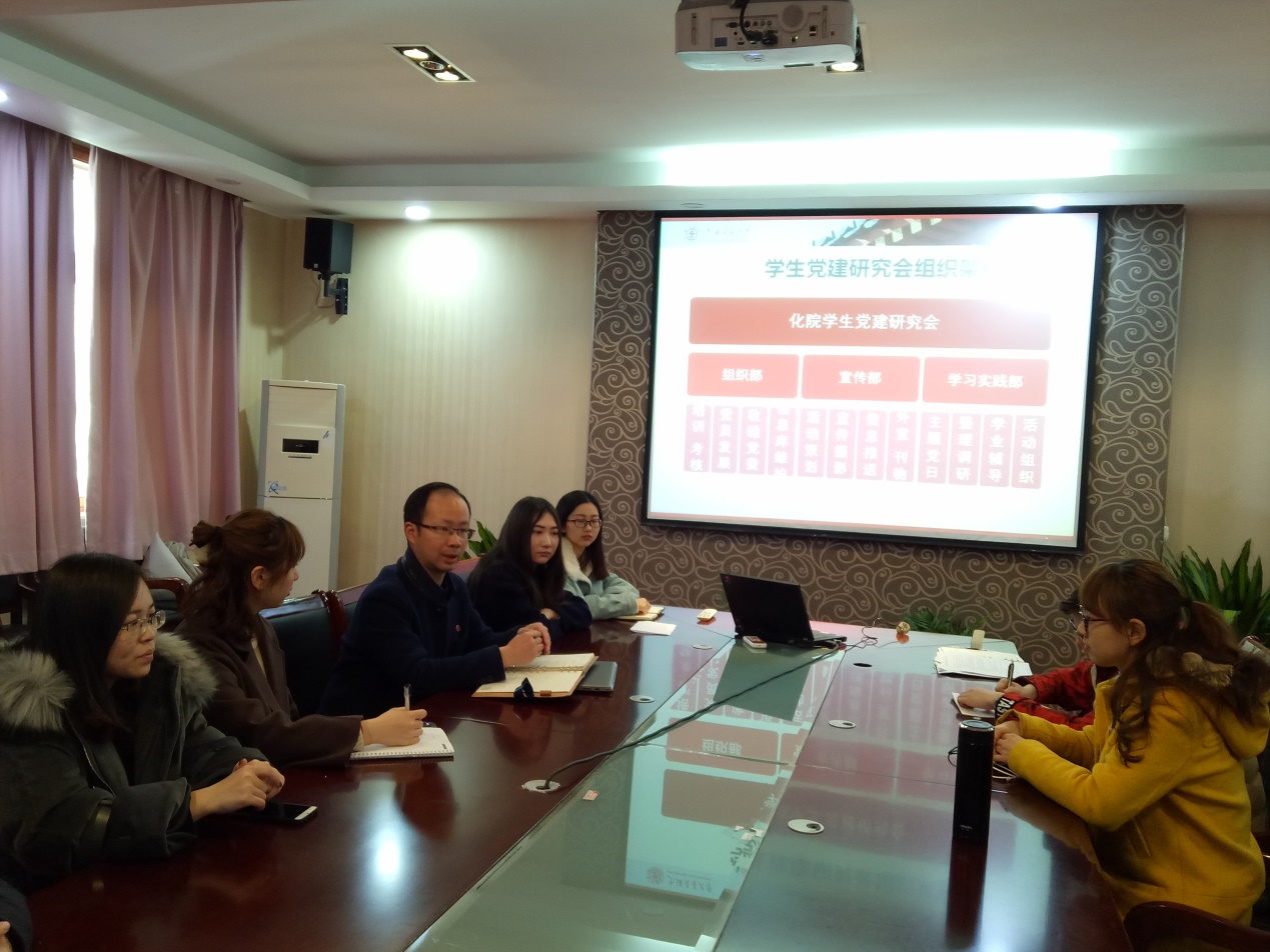 前任会长王雯发言介绍了党建研究会(即原党建联席会)在过去两年中开展的党建工作和系列活动,并表示化院学生党建工作在过去工作扎实,成绩突出。党建联席会的成员们践行了“能担当,做实事,塑形象”的承诺,引导同学们进一步端正入党动机,坚定理想信念,做合格党员。