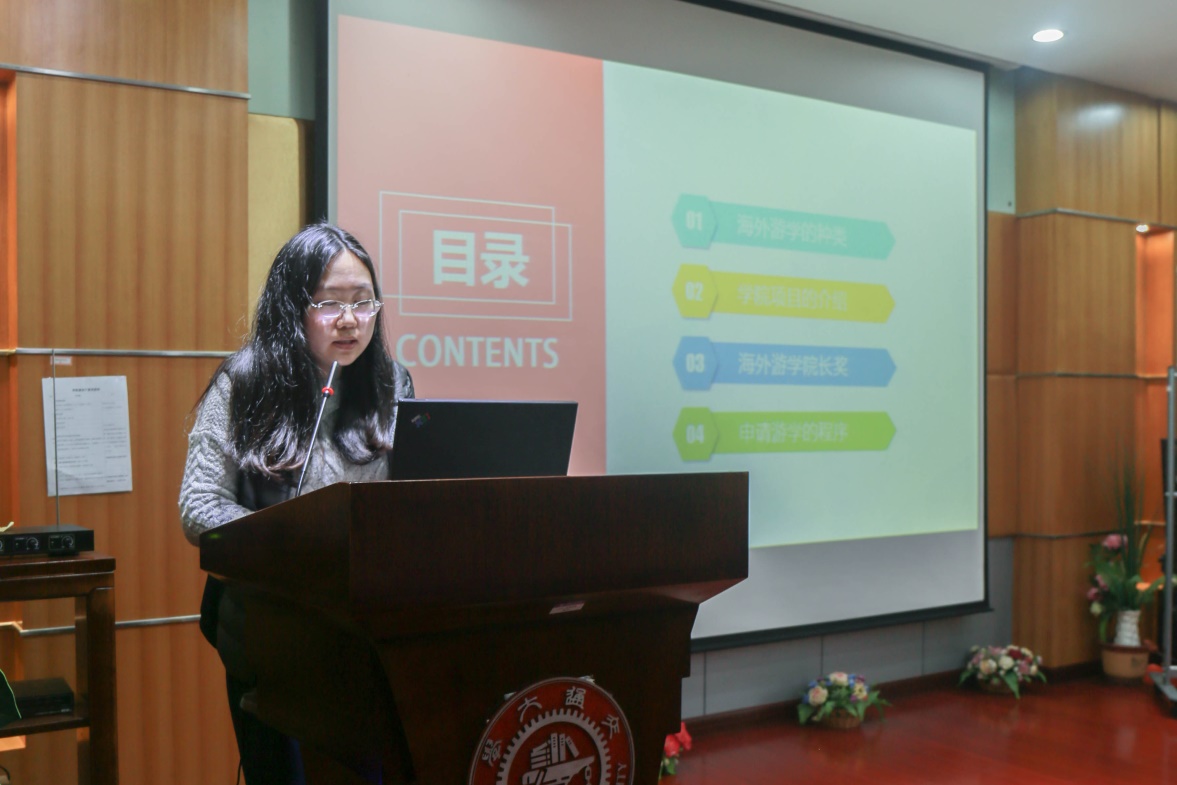 随后致远学院的沈佳琪和任之初同学分别向同学们介绍了美国高校PhD和海外研修的申请方法,包括申请条件,如何进行申请工作以及申请过程中的小技巧。化院博士生张嘉城也进行了经验分享,内容主要包括在英国的交流经验总结,温馨提示以及在海外交流中需要注意的问题等。