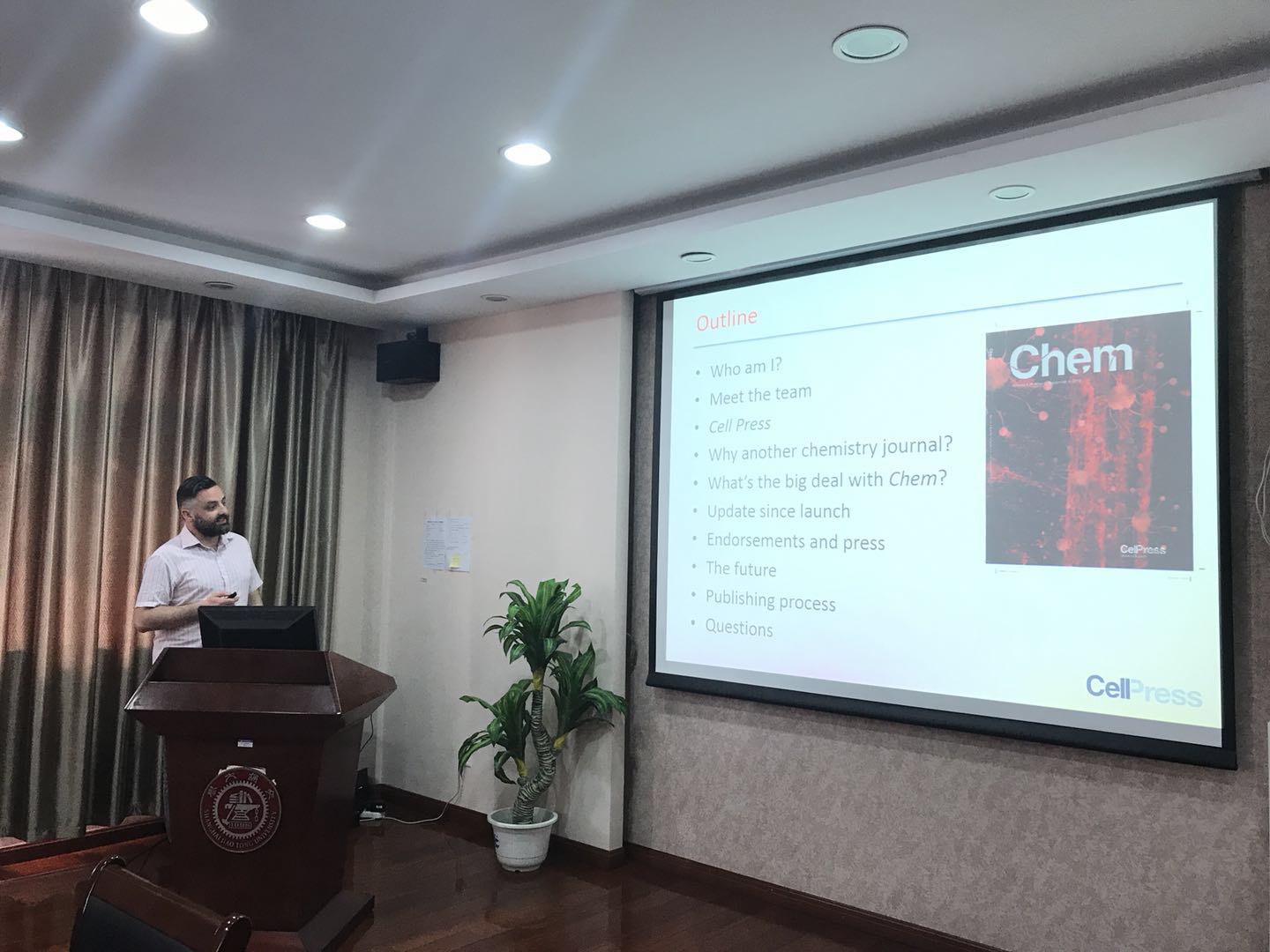 。Dr. Eagling受邀做开场报告。化院朱新远教授、邱惠斌教授、李涛特别研究员、丁蓓特别研究员、李林森特别研究员、钟洪亮特别研究员、密西根-上海交大联合学院薄首行教授等参与了研讨会。 朱新远院长首先代表学院向Dr. Eagling和Dr. Liao的到来表示热烈的欢迎,并简要介绍了学院历史和发展情况。随后,Dr. Eagling做了题为“Publishing in Chem from Cell Press”的专题报告,并耐心解答了在座师生就Chem期刊提出的问题。化院李涛特别研究员、丁蓓特别研究员等做了专题报告,并与两位编辑和在场师生展开热烈交流。 Chem 是 Cell Press 最新推出的综合性化学期刊,目前已经出版23期。作为生物领域顶级期刊 Cell 的第一份自然科学类姐妹期刊,Chem致力于推广和促进化学及其交叉领域的创造性突破,刊发旨在解决全球性挑战的基础和应用研究论文。