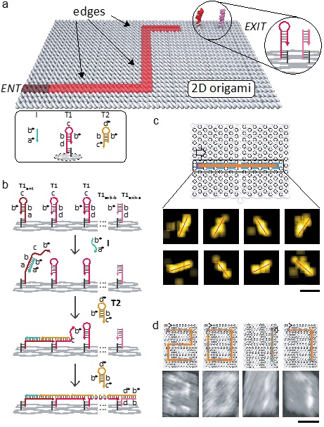 樊春海教授与同济大学柳华杰教授(原上海应用物理研究所研究员)、慕尼黑工业大学教授Fritz Simmel等合作,通过将DNA杂交链式反应精确“锚定”到DNA纳米结构上,可以实现在纳米界面上沿着设计路径的分子级联反应。借助于原子力显微镜和超分辨显微镜等单分子成像技术,研究者可以清晰观察到DNA分子机器人的行走轨迹。该DNA分子机器人在引发信号链的作用下,可以在沿着预先设定的路径直线或转弯行走。