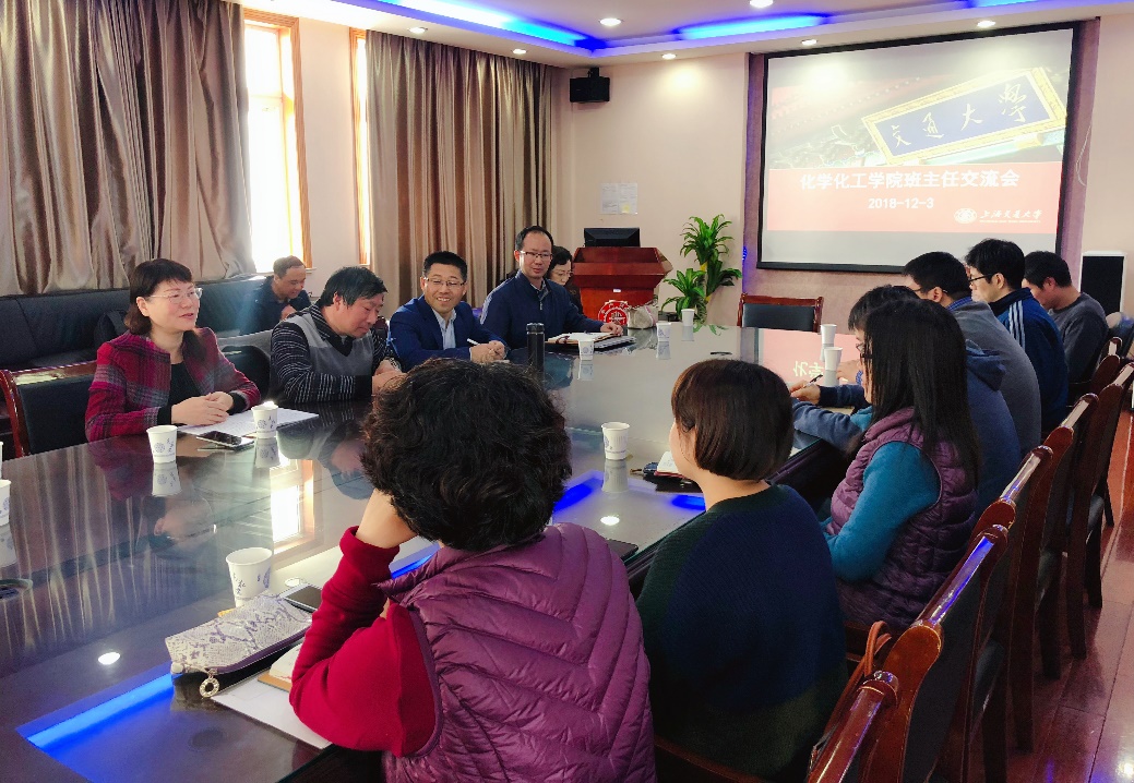 2018年秋季学期班主任年终座谈会在化学楼A518会议室举行。学院党委书记贾金平,党委副书记郑浩、阎文璠, 工口实验室