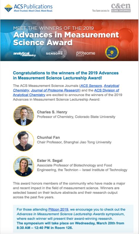该奖项由美国化学会分析化学委员会协同ACS Sensors,Analytical Chemistry和Journal of Proteome Research等三份美国化学会旗下专业期刊共同发起,以表彰在测量科学领域做出重要贡献的科学家。 樊春海教授是该奖设立以来第一位来自发展中国家的获奖人。Angewandte Chemie International Edition杂志拟对此奖项作专题新闻报道并介绍获奖人。