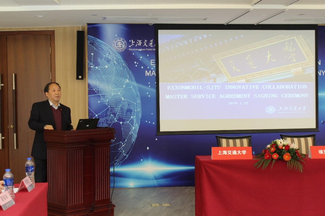涂永强院士在签约仪式上致辞,代表工口实验室 对埃克森美孚化工一行表示欢迎,对双方签约表示祝贺。感谢埃克森美孚公司长期以来对交大和化院的支持和帮助,相信双方的合作一定能推动基础科学的发展和应用,同时促进学科发展和人才培养。