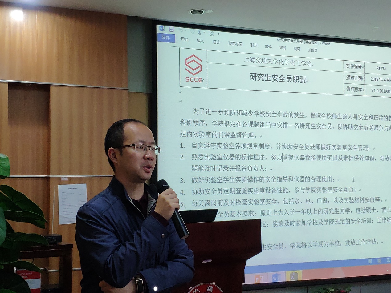 在学院管理的基础上,组建了学生参与的研究生安全队伍,担负起课题组的安全责任,协助学院进行实验安全管理。郑浩老师讲解了安全员的各项职责,并为安全员提出了三点要求:一是熟悉学校学院的安全制度;二是及时排查实验室中的安全隐患;三是积极参与实验室之间的安全互查。