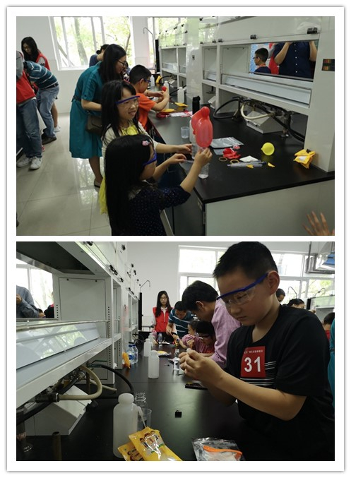 志愿者宋佳恬带领小朋友来到在化学A楼228室开始趣味的瓶子吹气球实验,小朋友们利用实验台上的小苏打和柠檬酸,小心翼翼进行实验,看到被气体吹起来的气球时大家都非常兴奋,互相展示实验成果。期间,小朋友们大胆想象、勇敢提问,并动手多次练习实验。