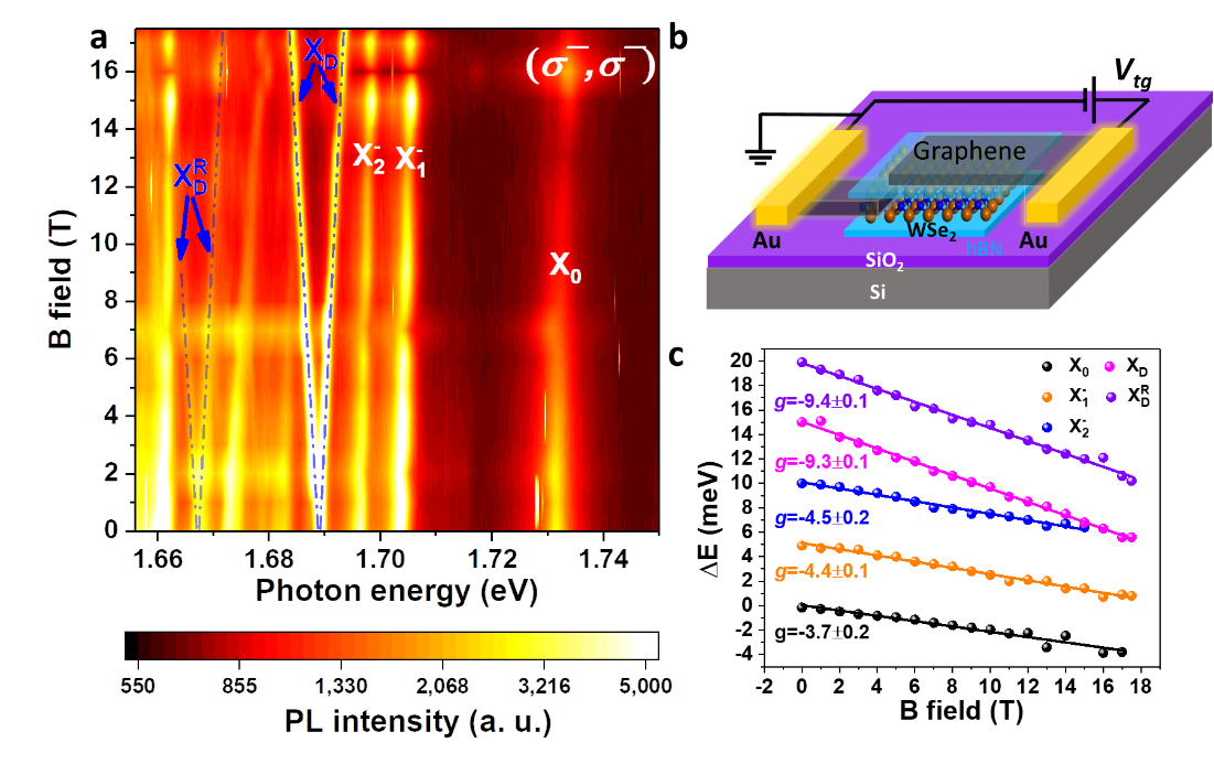 首先,通过PL随磁场强度的变化发现(图2),由于塞曼效应,激子态X_D^R展现和暗激子X_D类似的光谱行为,都呈现一个V字形图案;同时可以通过线性拟合得到X_D^R和X_D的g值在误差范围内相当,分别为-9.4和-9.3。