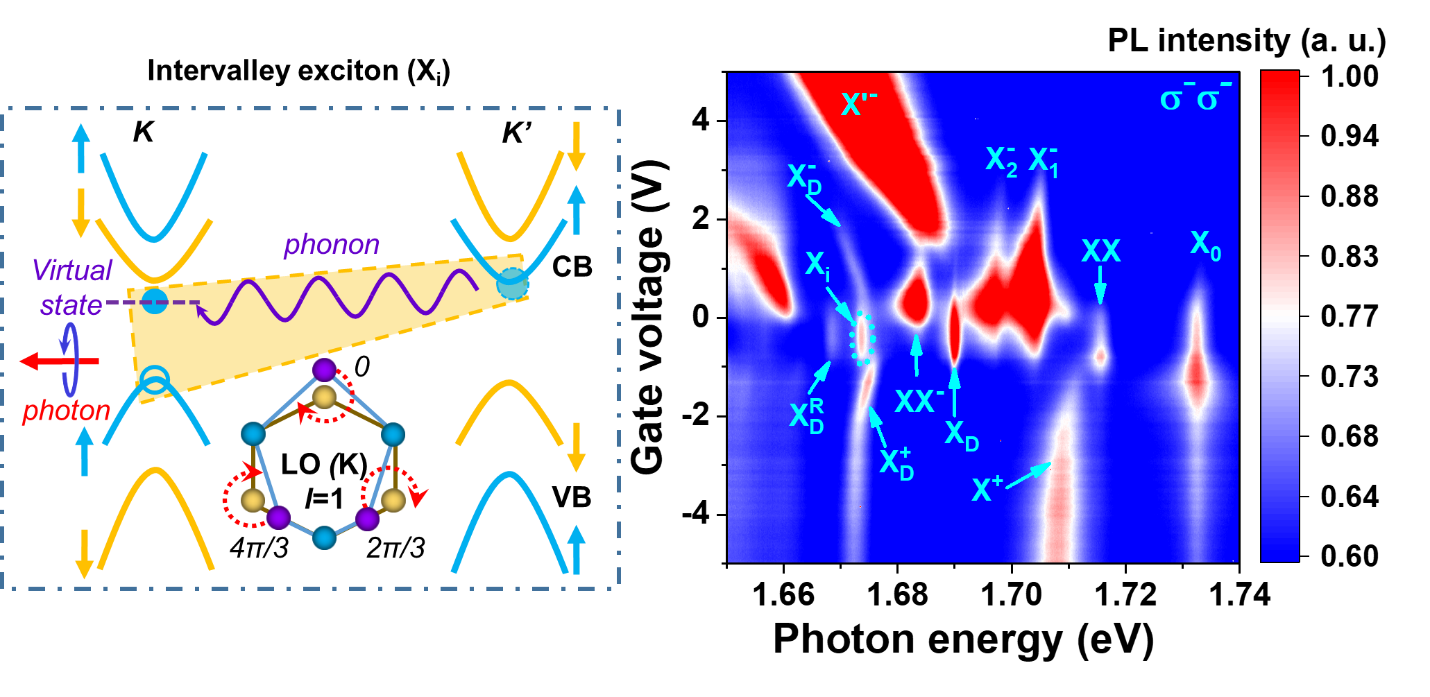 图 1 BN/WSe2/BN三明治结构器件谷间激子和手性声子LO(E')相互作用示意图及其不同静电掺杂下的PL特性