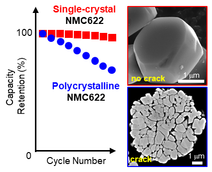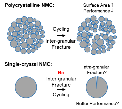 镍钴锰酸锂(NMC)和镍钴铝酸锂(NCA)三元正极材料能提供较高的能量密度和功率密度,已经广泛应用于新能源汽车动力电池。目前,商业化的三元正极材料大多是由纳米级别一次颗粒团聚形成的10微米左右的二次球型多晶材料。多晶NMC内部存在大量晶界(grain boundary)。在电池充放电过程中,由于各向异性的晶格变化,多晶NMC容易出现晶界开裂,导致二次颗粒发生破碎,比表面积和界面副反应快速增加 (图1),导致电池阻抗上升,性能快速下降。