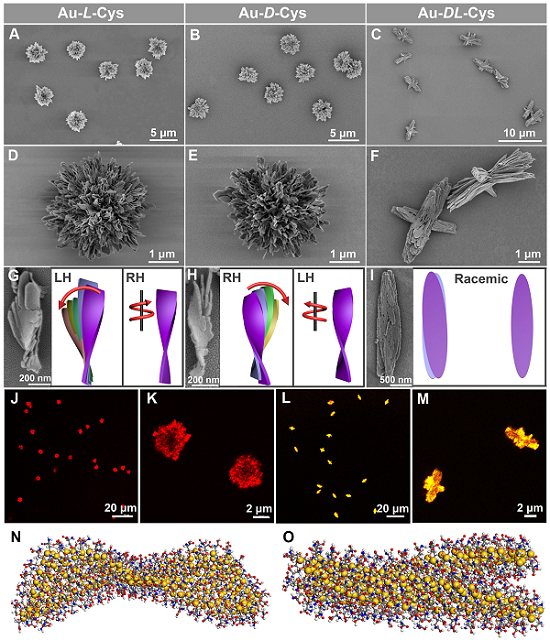 尺寸多分散的纳米粒子在自组装过程中,由于热力学原因,往往形成大块聚集体或者简单形貌组装体。如何克服各种能量势垒,使这些纳米粒子形成多级复杂有序结构呢?作者们基于金-半胱氨酸(Au-Cys)材料成功合成了具有高度复杂结构的手性粒子,并揭示了复杂结构的形成机理。研究发现,Au和Cys生成的纳米片,在表面活性剂CTAB作用下,避开了形成无规大块聚集体的组装路径,形成了多级复杂有序的粒子。当参与反应的半胱氨酸为对映体纯的L-或D-型时,形成了类颗石藻结构的粒子(CLIPs);而当参与反应的为外消旋半胱氨酸时,形成了皮艇状粒子(KPs)。进一步结构分析显示,CLIP粒子中含有明显的两级结构手性:第一级结构手性来源于扭曲的纳米带;第二级结构手性来源于纳米带与周围纳米带之间的螺旋排列方式。KP粒子也有多级结构,但却不存在手性。